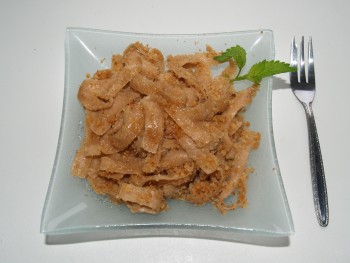 Teigwaren kalt abschrecken und mit den Bröseln und dem Fruchtzucker